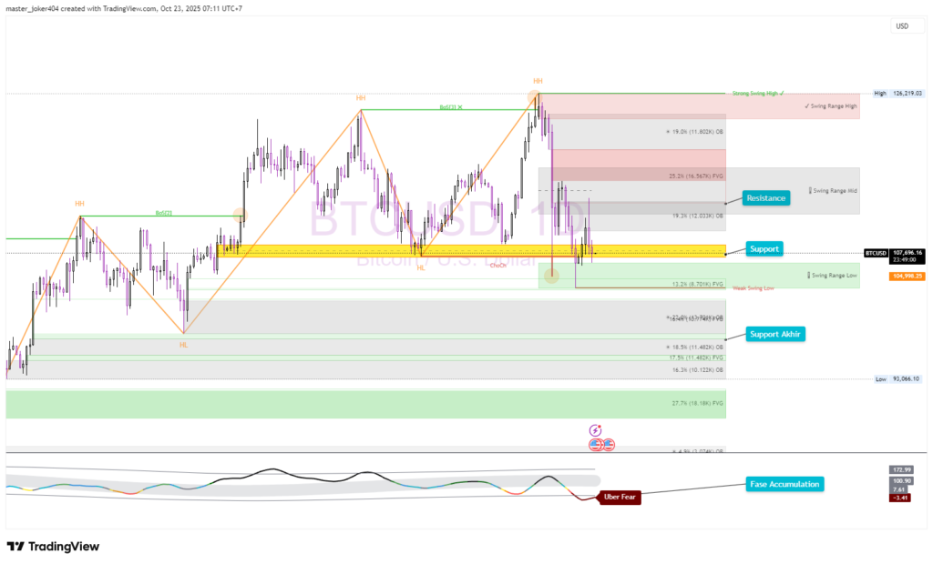 - Akumulasi Whales: Ada laporan mengenai 26,500 BTC ($2.8 miliar) yang mengalir ke alamat akumulasi, mengindikasikan “smart money” mengakumulasi di level ini.