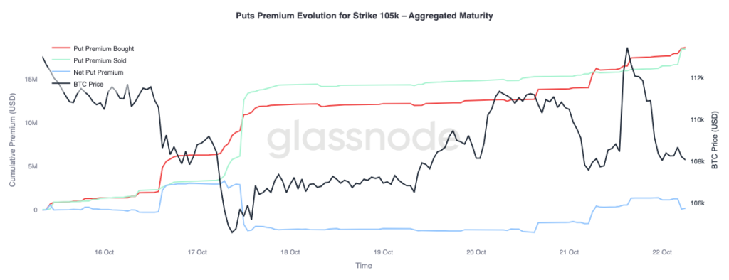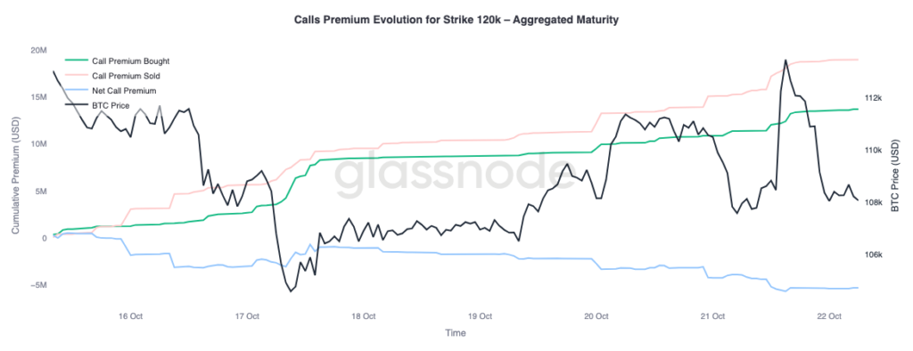 Yang paling mengungkap adalah respons pasar terhadap rally. Pada kenaikan 6% dari $107.5K menjadi $113.9K, reaksi pasar justru menambah eksposur put, bukan membeli call. Pola ini mengungkapkan bahwa kenaikan harga jangka pendek dilihat sebagai peluang untuk melindungi nilai, bukan sebagai awal tren naik baru.
