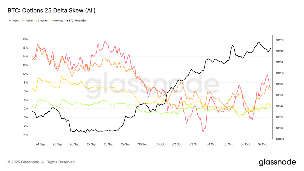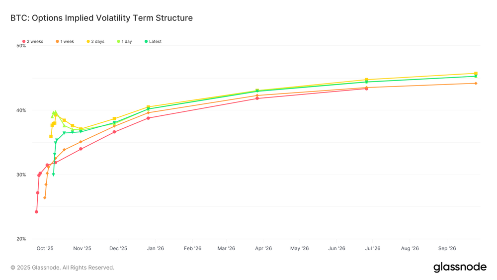 • 25-Delta Skew menyempit secara dramatis, dari 18 poin volatilitas (put-rich) menjadi hampir netral. Ini menandai pergeseran dari lindung nilai defensif ke posisi yang lebih optimis.