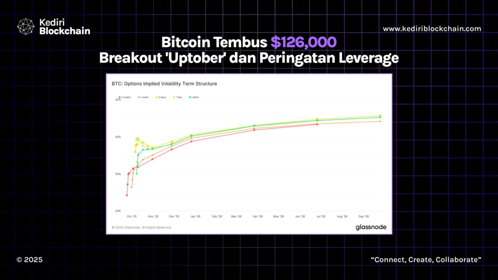 Dengan skew yang netral dan IV yang tinggi, posisi untuk kenaikan harga (bullish positioning) menjadi lebih mahal dan ramai. Ini menyiratkan bahwa volatilitas jangka pendek cenderung tetap tinggi saat pasar mencerna kenaikan harga ini.