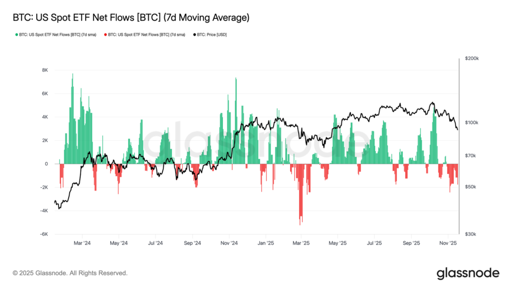 - Permintaan Institusional: ETF spot AS mencatat aliran keluar yang dalam dan persisten.