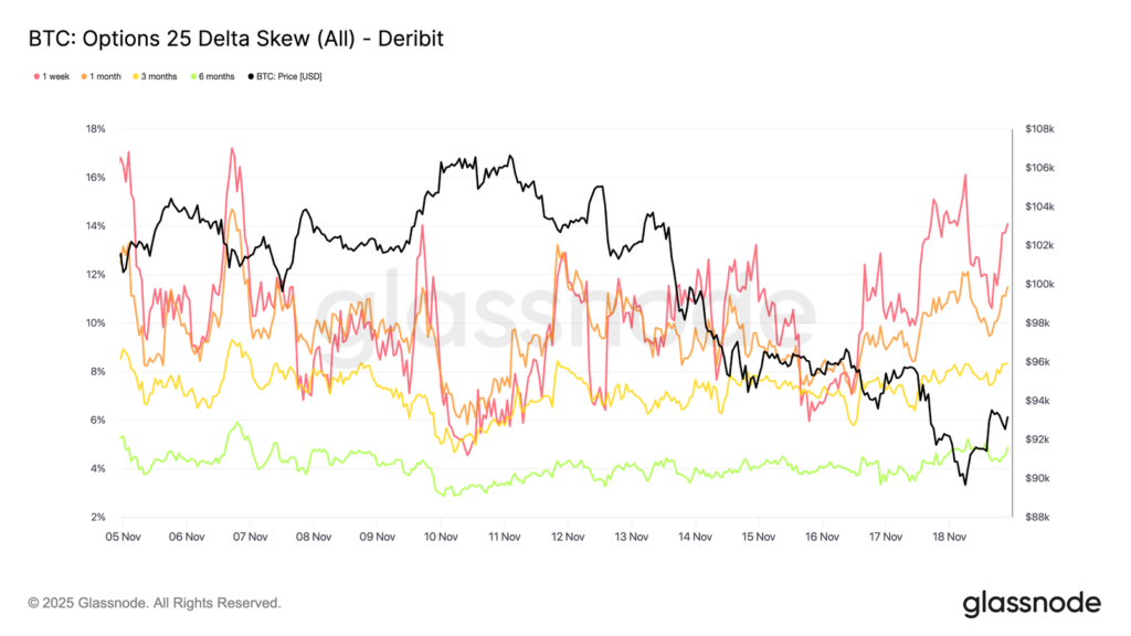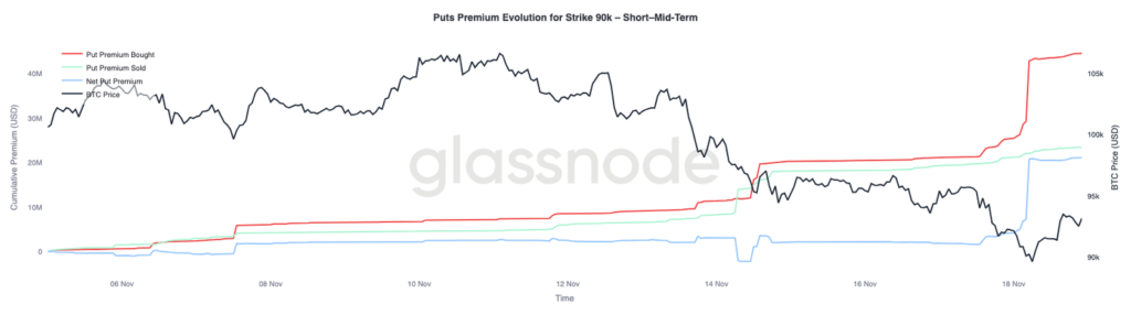 | Premi Put Strike $90K | Melonjak tajam setelah harga tembus $93K. | Permintaan hedging intensif di sekitar level psikologis kritis. |