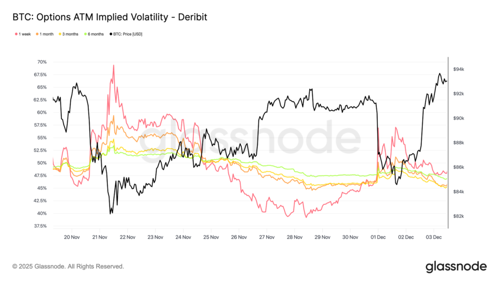 - Skew yang Melunak: 25-delta skew untuk tenor 1-minggu turun drastis dari 18.6% menjadi 8.4%, menandakan permintaan asurasi downside yang mendesak telah mereda.