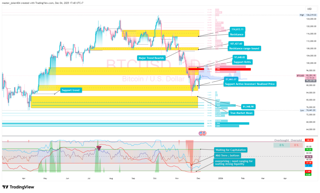 - Pemicu: Kegagalan berulang di zona $96K–$106K, diikuti kehilangan support $81K (True Market Mean).