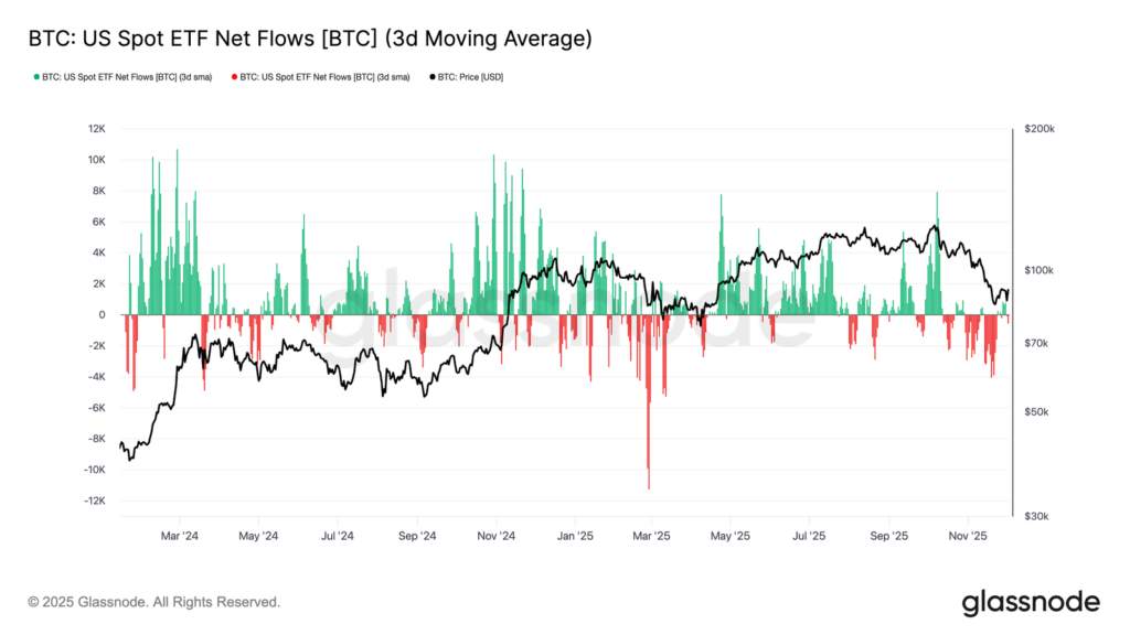 - Aliran Keluar ETF: ETF Spot Bitcoin AS telah beralih ke arus keluar (outflow) net dalam beberapa pekan terakhir. Ini menandakan kehati-hatian institusional dan menghilangkan salah satu sumber pembelian struktural terbesar.