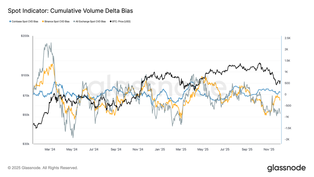 - Cumulative Volume Delta (CVD) Negatif: CVD di bursa besar seperti Binance tetap negatif, mengindikasikan tekanan jual agresif masih dominan di pasar spot. Tidak ada permintaan beli yang cukup agresif untuk menyerapnya.
