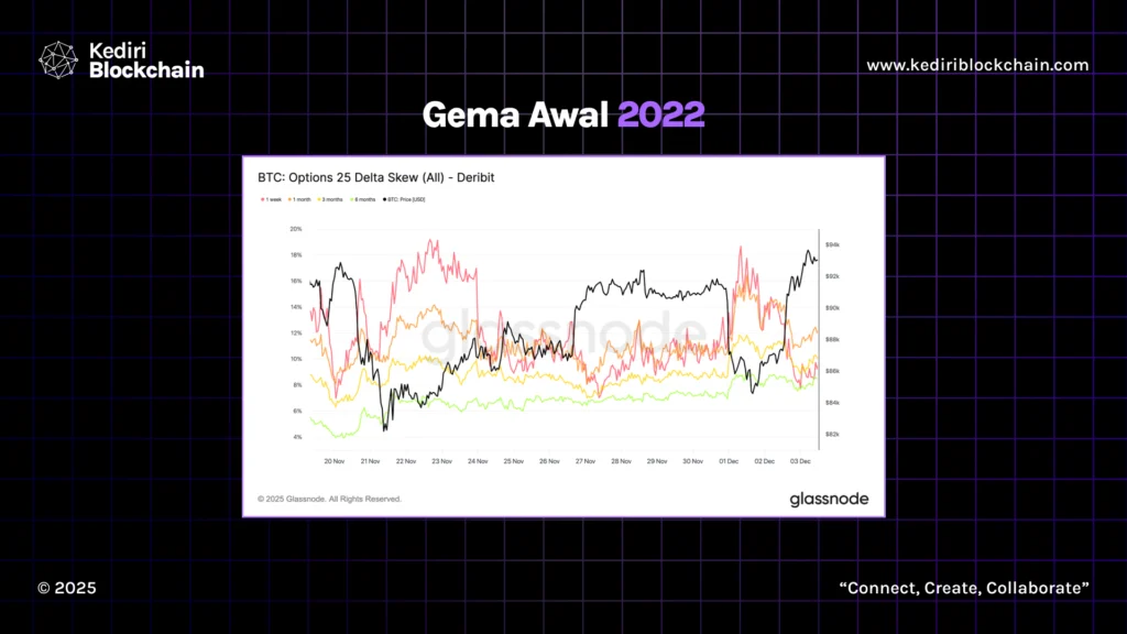 - Skew yang Melunak: 25-delta skew untuk tenor 1-minggu turun drastis dari 18.6% menjadi 8.4%, menandakan permintaan asurasi downside yang mendesak telah mereda.