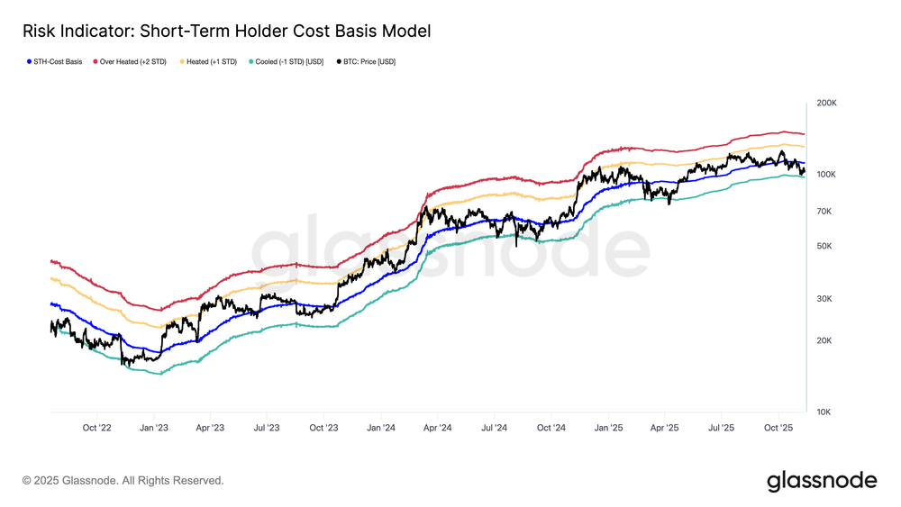 Bitcoin kini terkunci dalam kisaran $97,500 hingga $111,900. Level $111,900 adalah basis biaya pemegang jangka pendek (Short-Term Holder Cost Basis), yang secara historis menjadi pemisah sentimen bullish dan bearish.