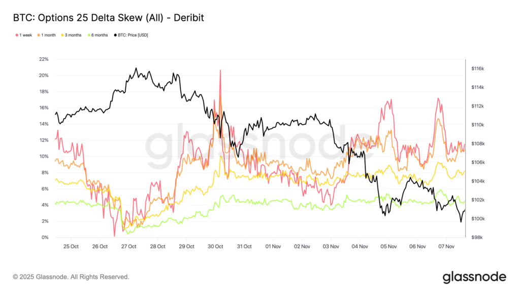 - 25-Delta Skew: Untuk ekspirasi jangka pendek, skew masih sekitar +11%, mengindikasikan trader terus membayar premium lebih mahal untuk opsi jual (puts) sebagai asuransi.