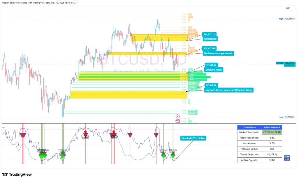 | Struktur Harga | Gagal reclaim $113K | Breakdown ke ~$100K | Konsolidasi Range-Bound ($97K – $111.9K) |