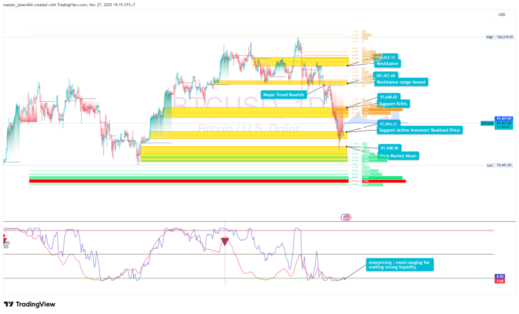 Struktur HargaKonsolidasi Range-Bound ($97K – $111.9K)Range Sempit & Rapuh ($81K – $89K)Breakdown konfirmatif; support utama bergeser lebih rendah.
