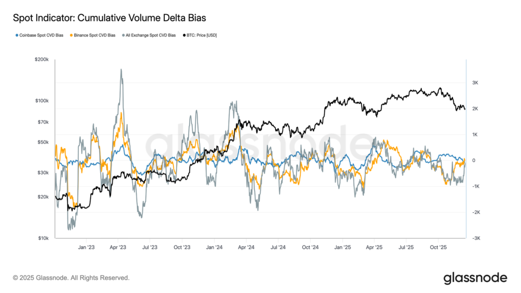 - Permintaan Spot yang Tidak Persisten: Aktivitas beli di pasar spot bersifat selektif dan sementara (short-lived). Meski ada dip-buying sesekali, tidak ada akumulasi terkoordinasi yang bertahan. Cumulative Volume Delta (CVD) di bursa seperti Binance cenderung datar, menunjukkan ketiadaan permintaan agresif.