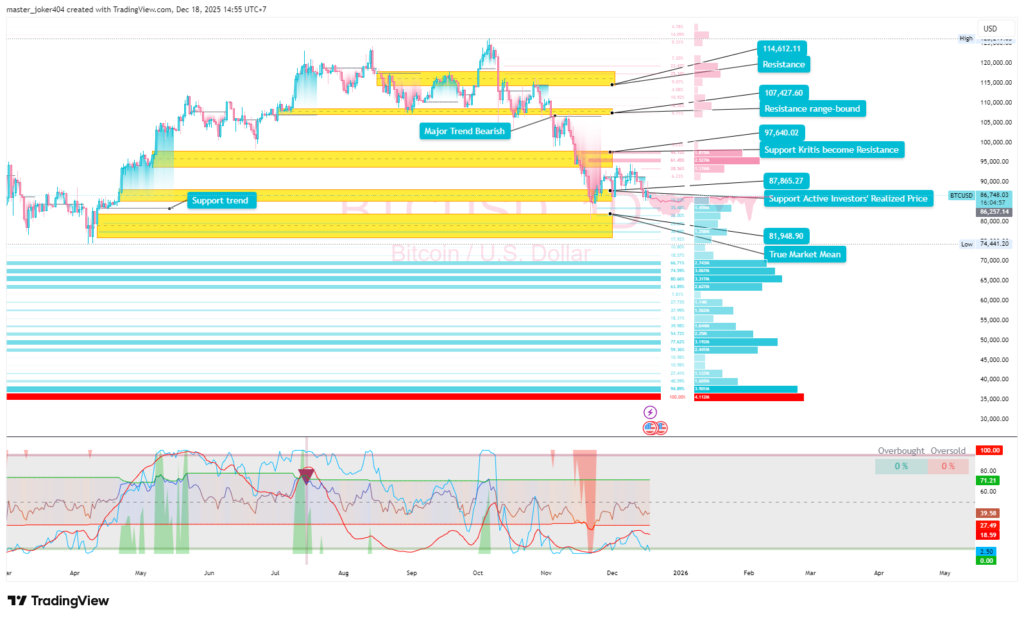 - Skenario Konsolidasi Lanjutan (Base Case): Harga tetap terperangkap antara $81.3K dan $95K hingga setelah ekspirasi opsi 26 Desember. Pasar terus mengandalkan permintaan “sabar” di support sementara tekanan overhead bertahan. Pemulihan berarti tertunda hingga ada katalis makro atau likuiditas baru yang signifikan.