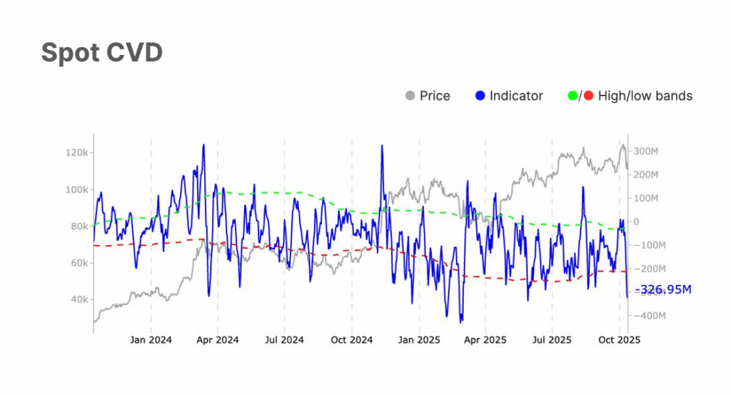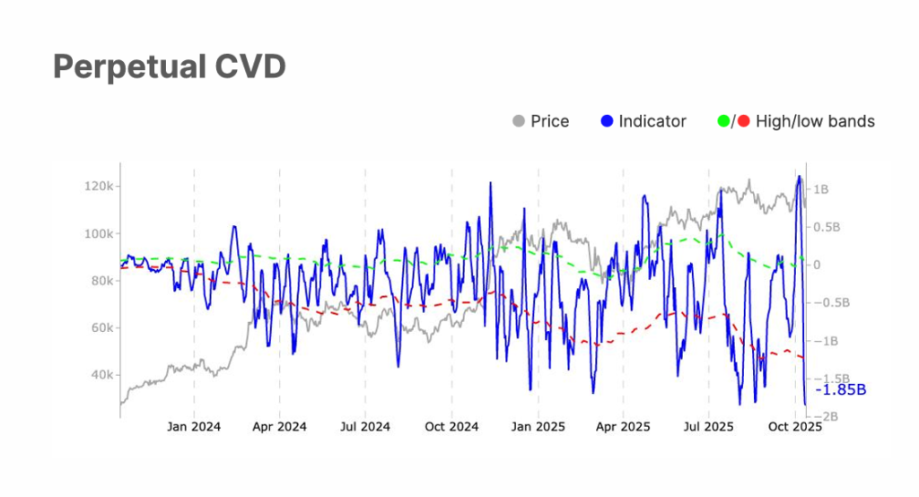 • Perpetual CVD: Jatuh dari +$1.1B ke -$1.8B. Ini menunjukkan bahwa trader leverage adalah pihak yang paling agresif menjual selama koreksi ini.