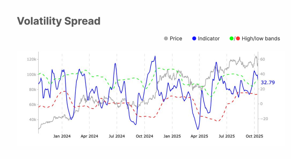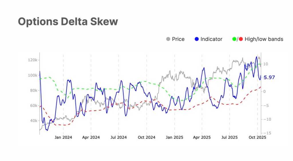 • 25-Delta Skew: Meningkat dari 4.82% ke 5.97%, mengindikasikan permintaan asuransi downside (put options) yang meningkat. Trader options mulai berhati-hati.