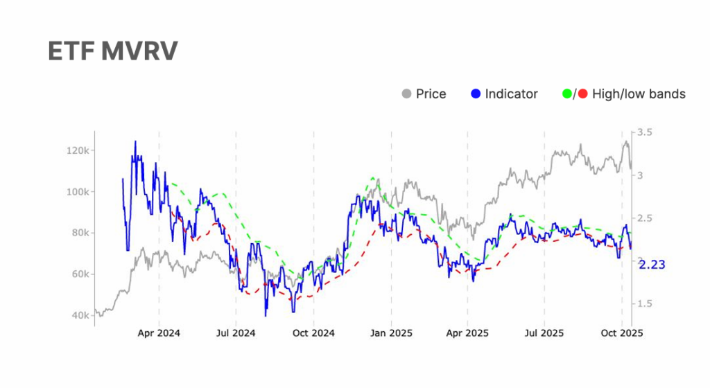 • ETF MVRV: Turun menjadi 2.23, mencerminkan profit-taking ringan di produk ETF, namun level ini masih menunjukkan profitabilitas yang sehat.
