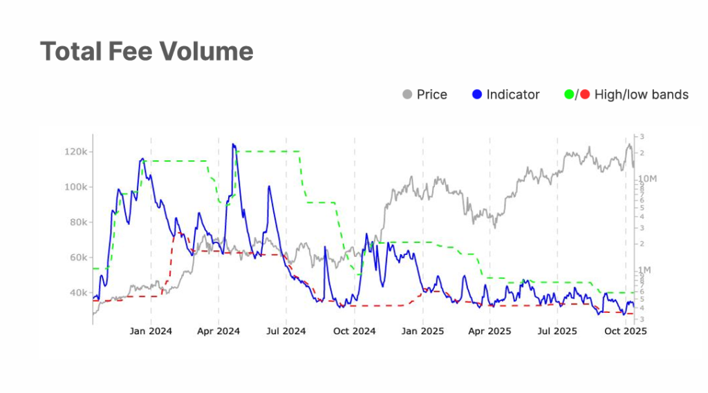 • Total Fee Volume: Turun 12.1%, mencerminkan berkurangnya kepadatan jaringan dan permintaan untuk konfirmasi cepat.