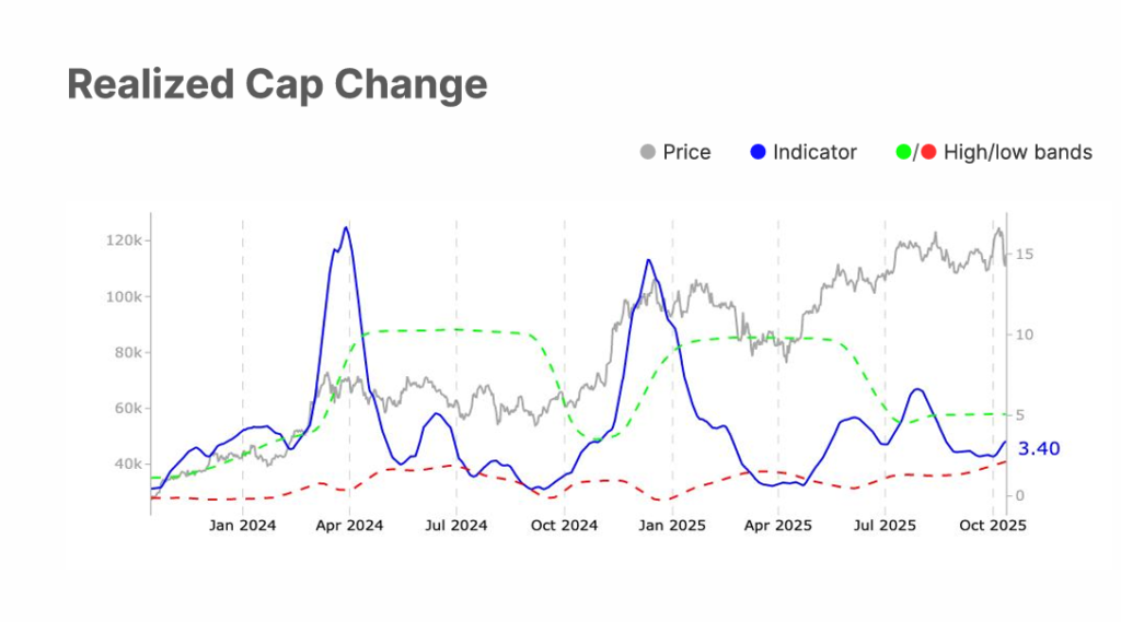 • Realized Cap Change: Naik 20.5% menjadi 3.4%. Ini adalah sinyal sangat penting. Meski harga koreksi, modal baru bersih terus mengalir ke Bitcoin. Investor membeli pada level harga saat ini, menguatkan fondasi.