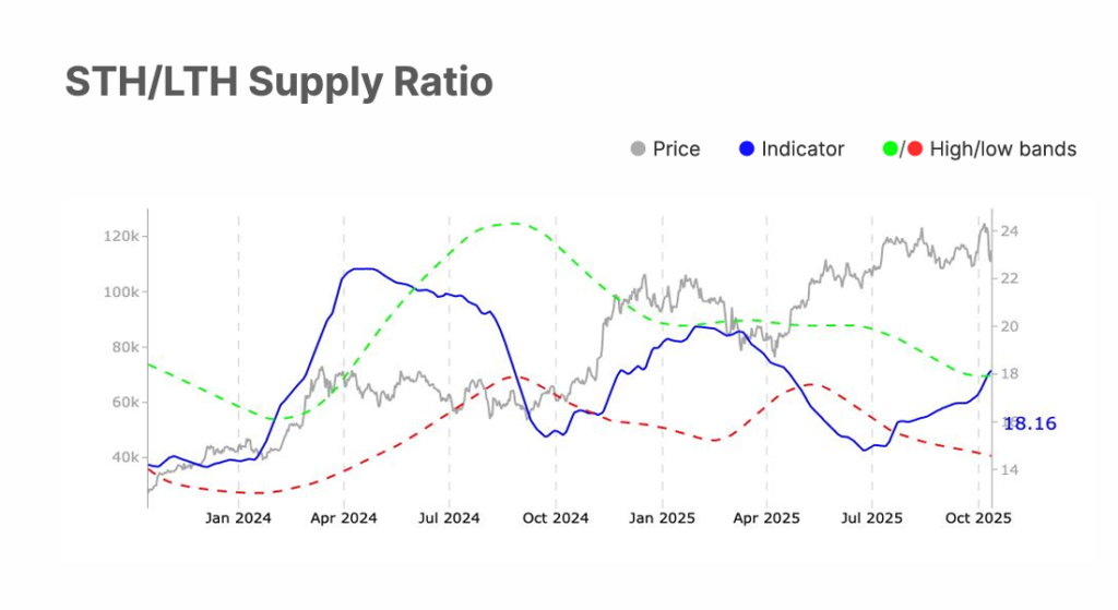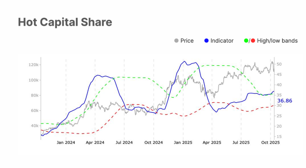 • STH/LTH Supply Ratio & Hot Capital Share: Keduanya meningkat, mengonfirmasi bahwa proporsi pemegang jangka pendek dan modal “panas” semakin besar.
