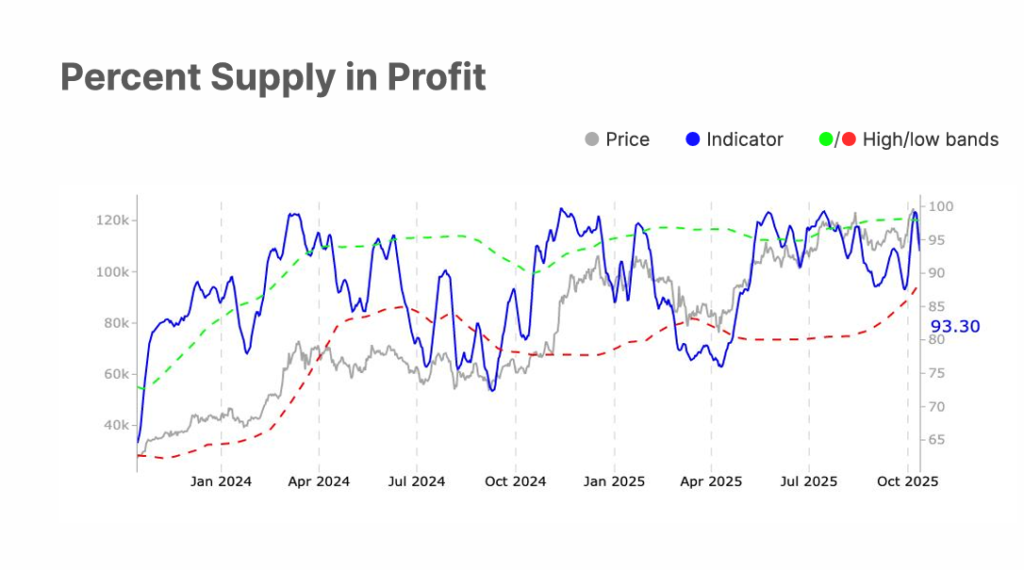 • Percent Supply in Profit: Turun dari puncak 98.1% menjadi 93.3%. Tekanan jual dari profit-taking telah mereda, karena lebih sedikit supply yang berada di posisi untung.