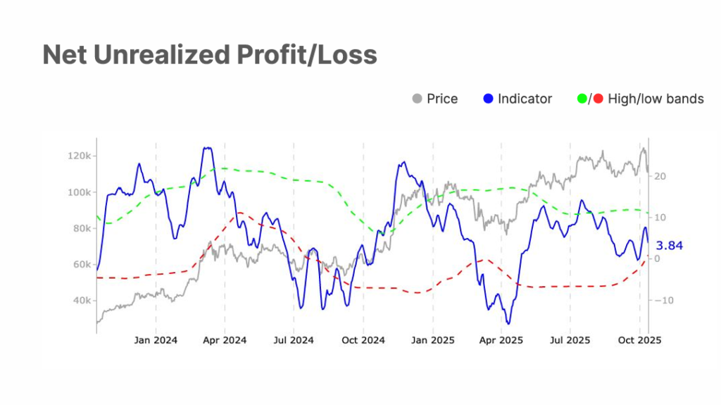 • Net Unrealized Profit/Loss (NUPL): Turun dari 6.7% ke 3.8%, meninggalkan zona “euphoria” dan kembali ke zona “belief”. Sentimen membaik secara sehat tanpa euphoria berlebihan.