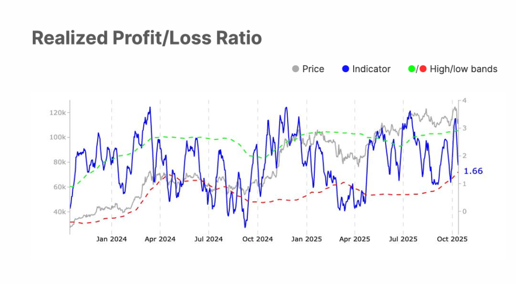 • Realized Profit/Loss Ratio: Anjlok dari 3.3 ke 1.7. Ini menunjukkan bahwa selama koreksi, investor tidak hanya mengambil untung, tetapi juga merealisasikan kerugian (capitulation). Ini adalah tanda klasik dari fase kapitulasi dalam sebuah koreksi.